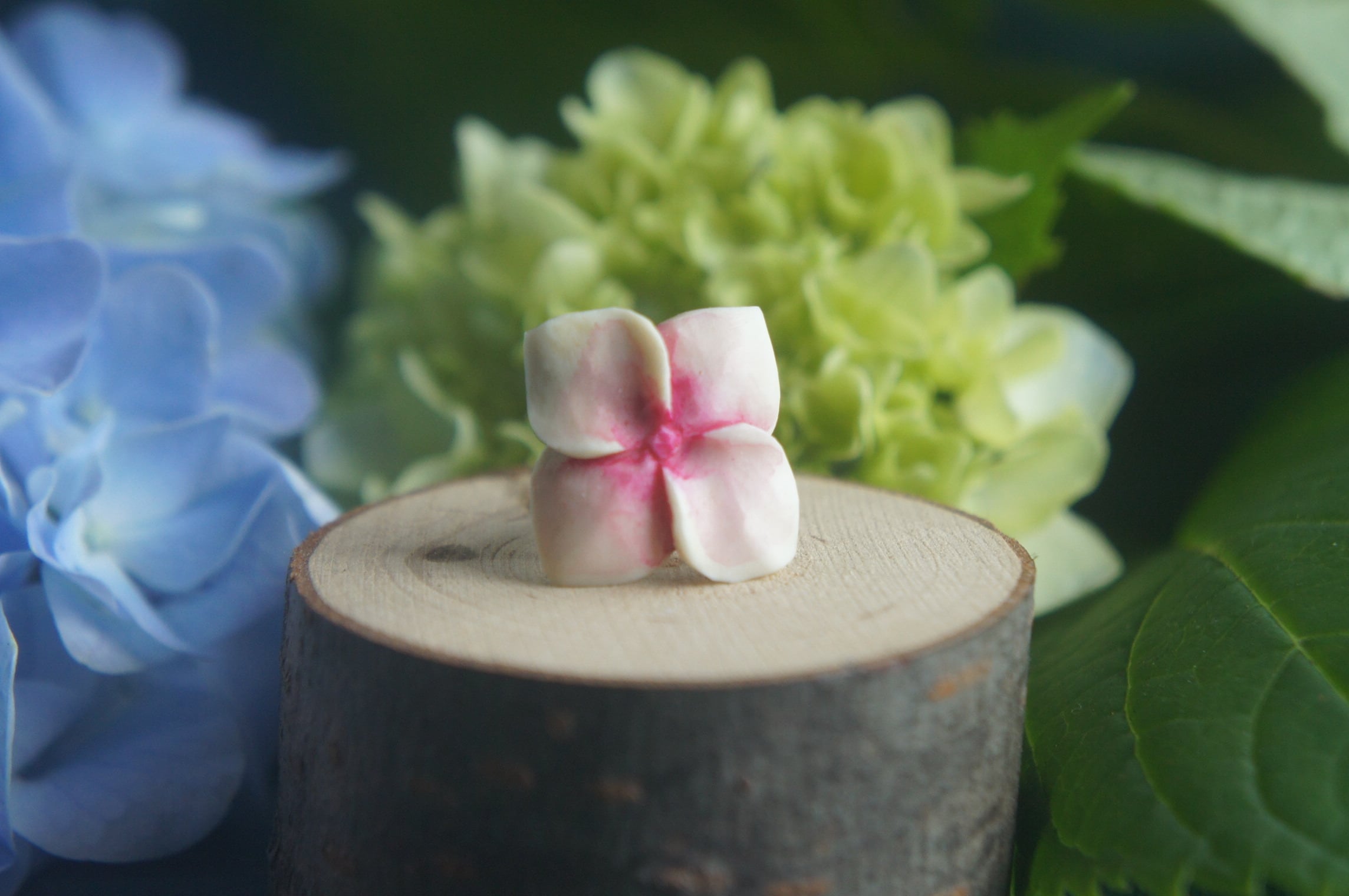 紫陽花の花の一片を鹿の角から彫刻しました。