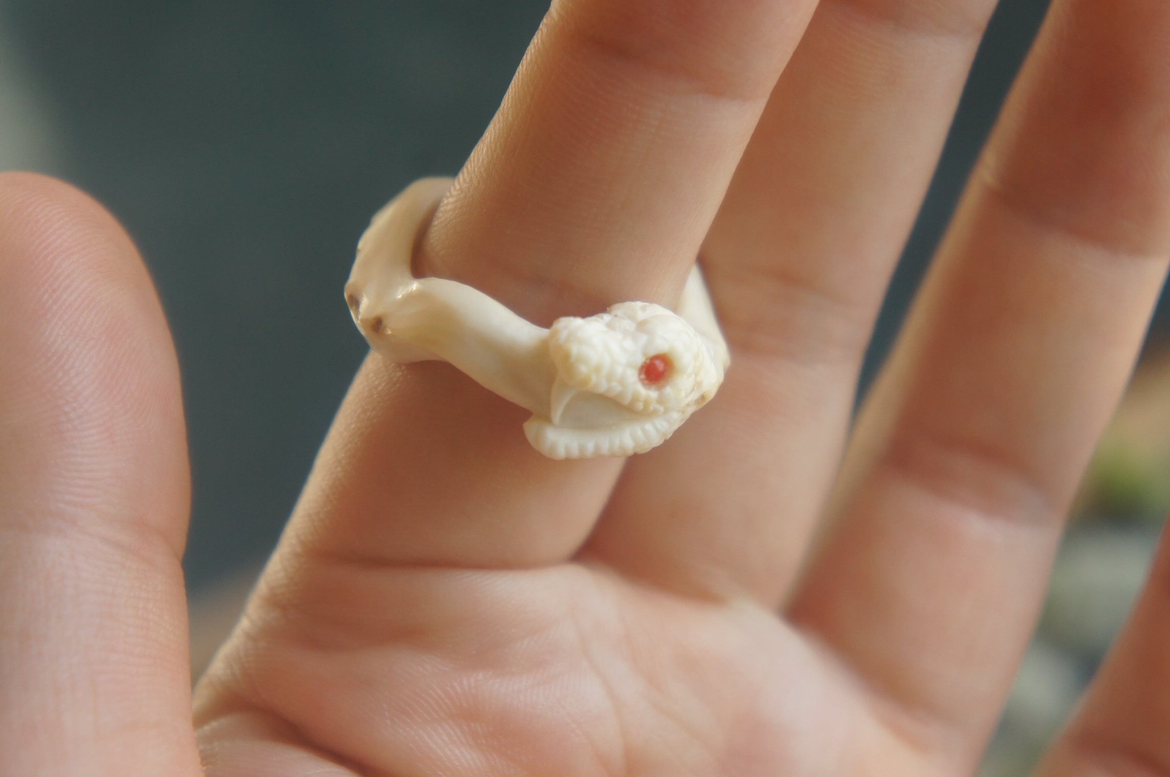 鹿の角から赤い目のウロボロスをモチーフにした指輪を彫刻しました。