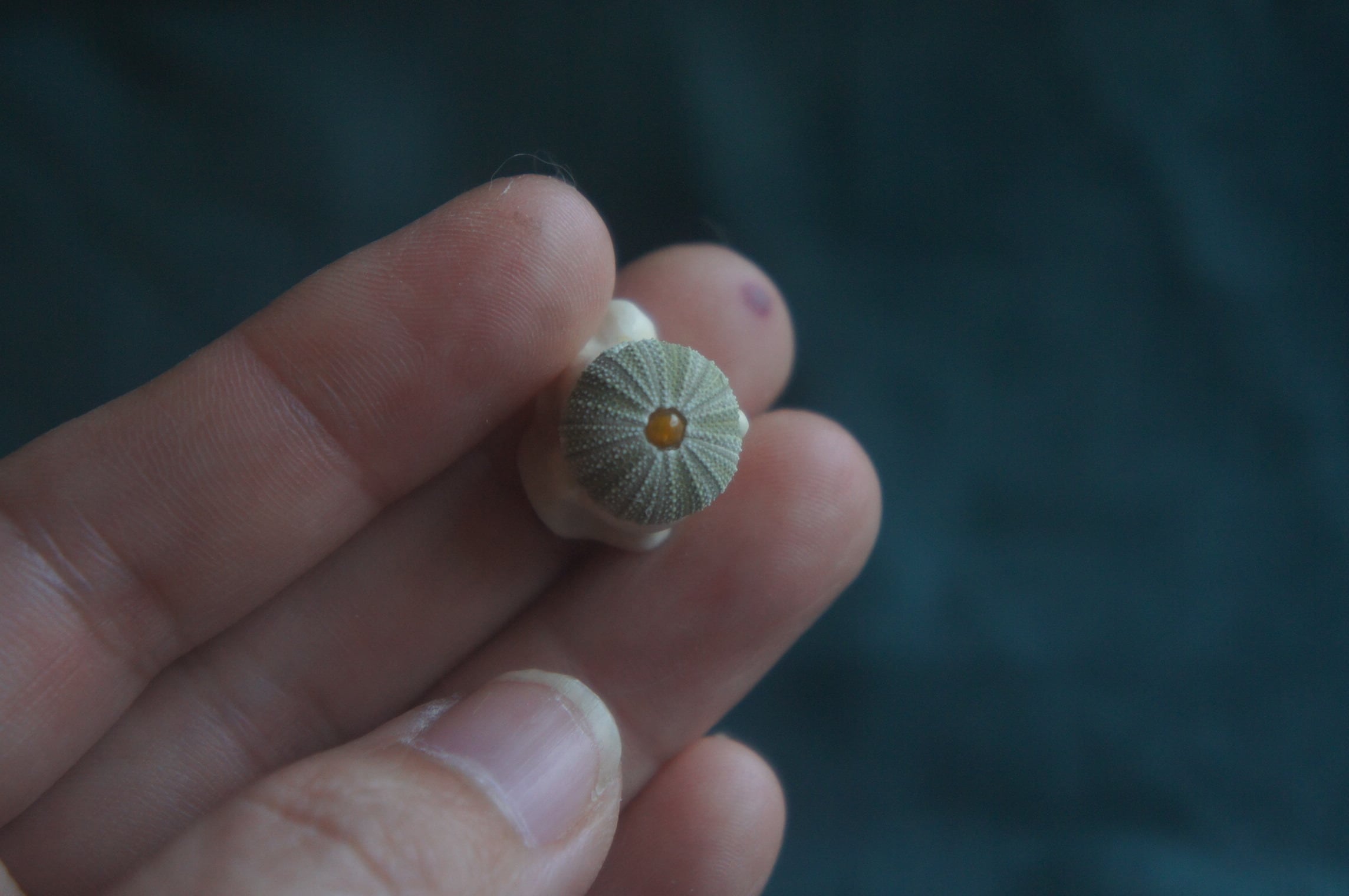 ウニの殻のてっぺんの穴が大きかったのでビーズで埋めています。