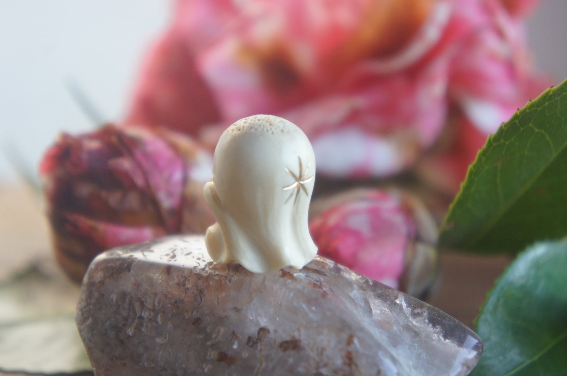 鹿の角から彫刻した、お祈りをするおばけ。