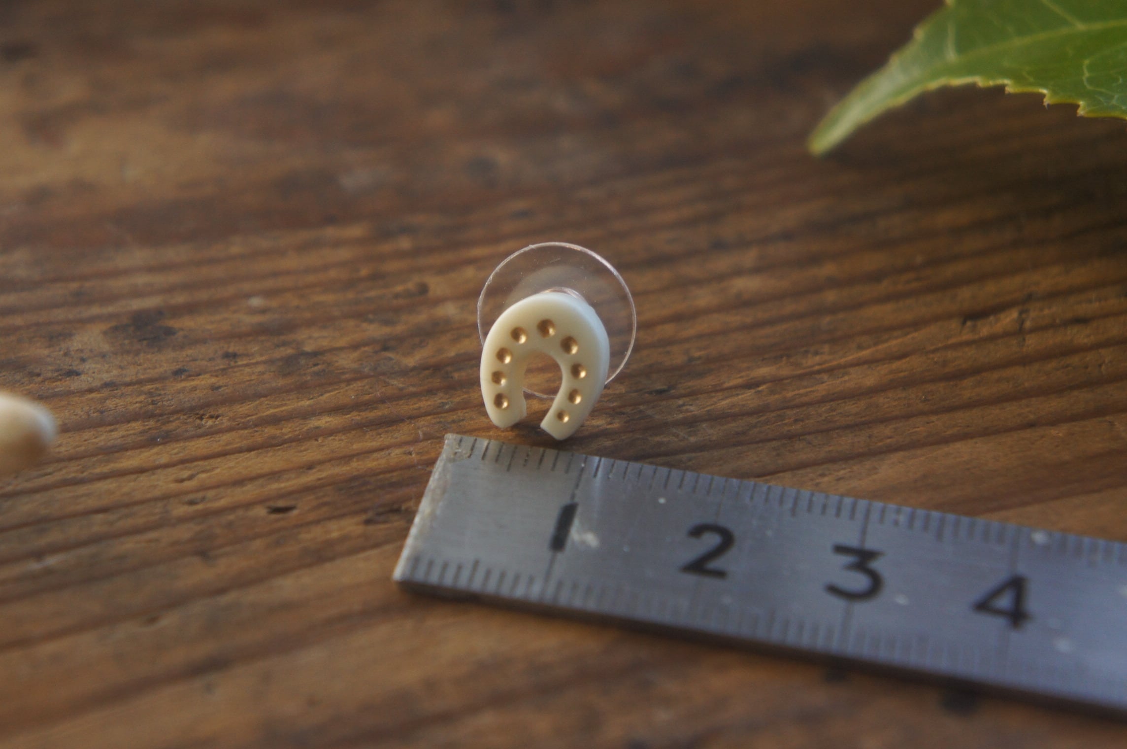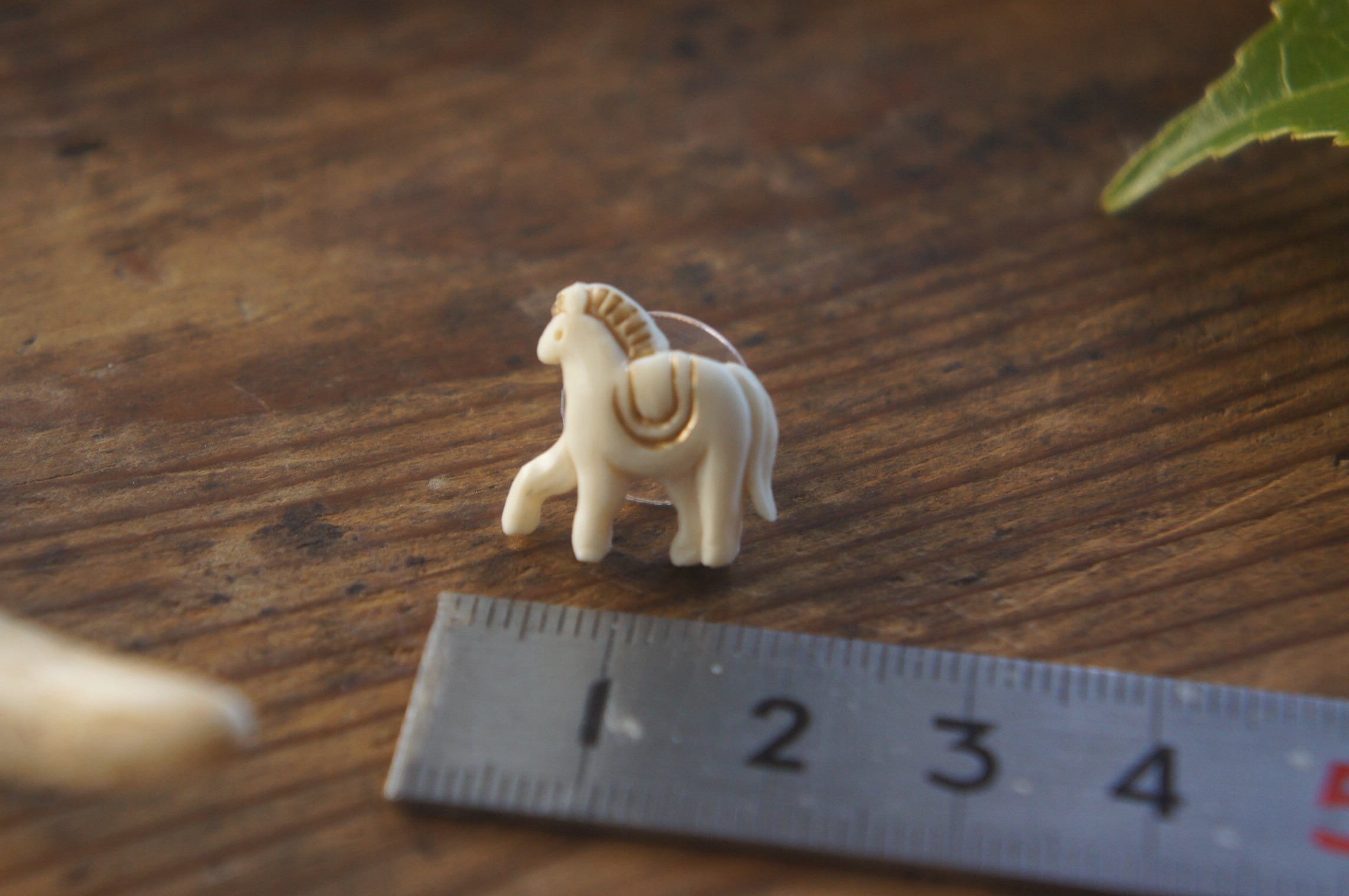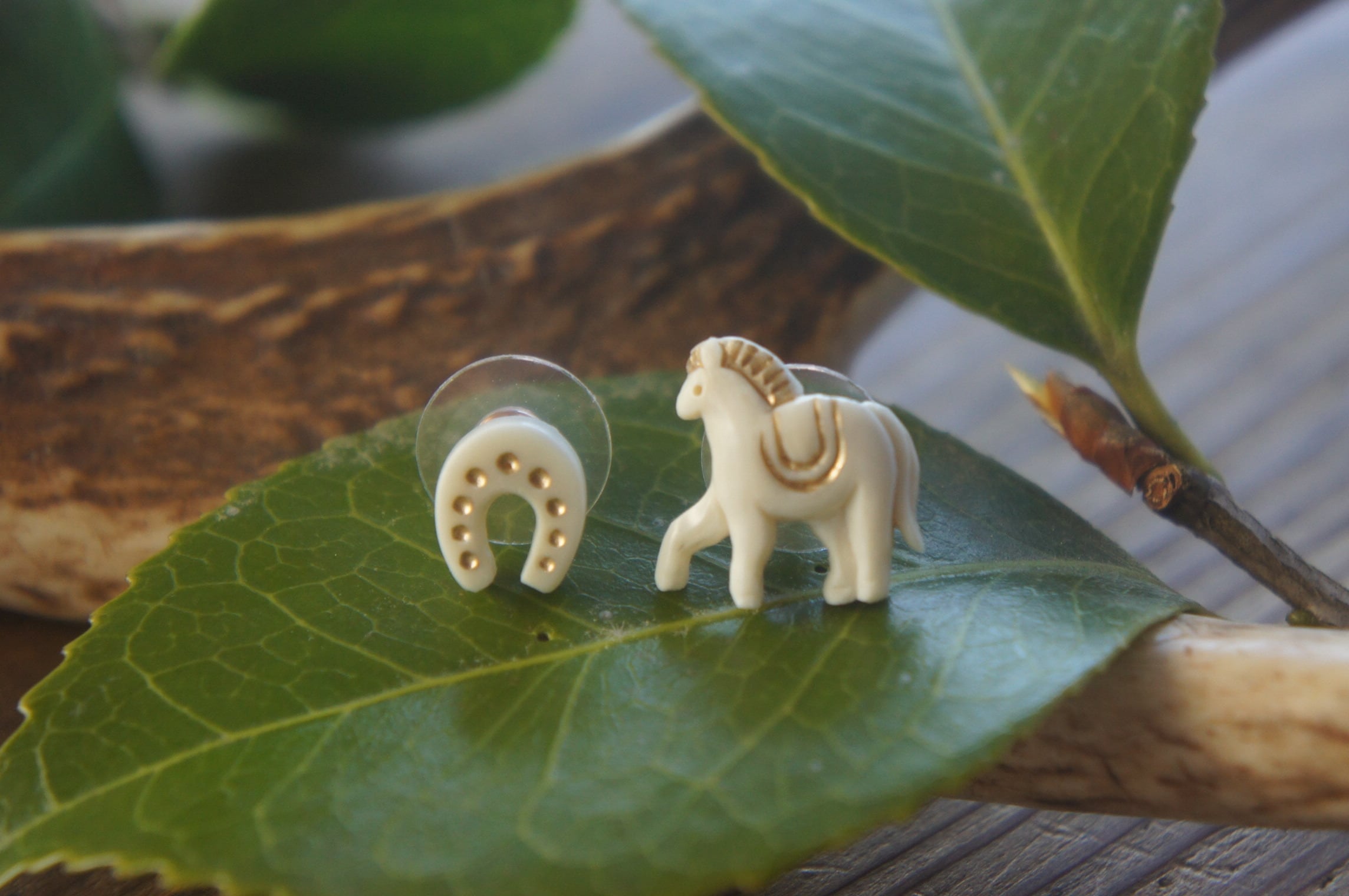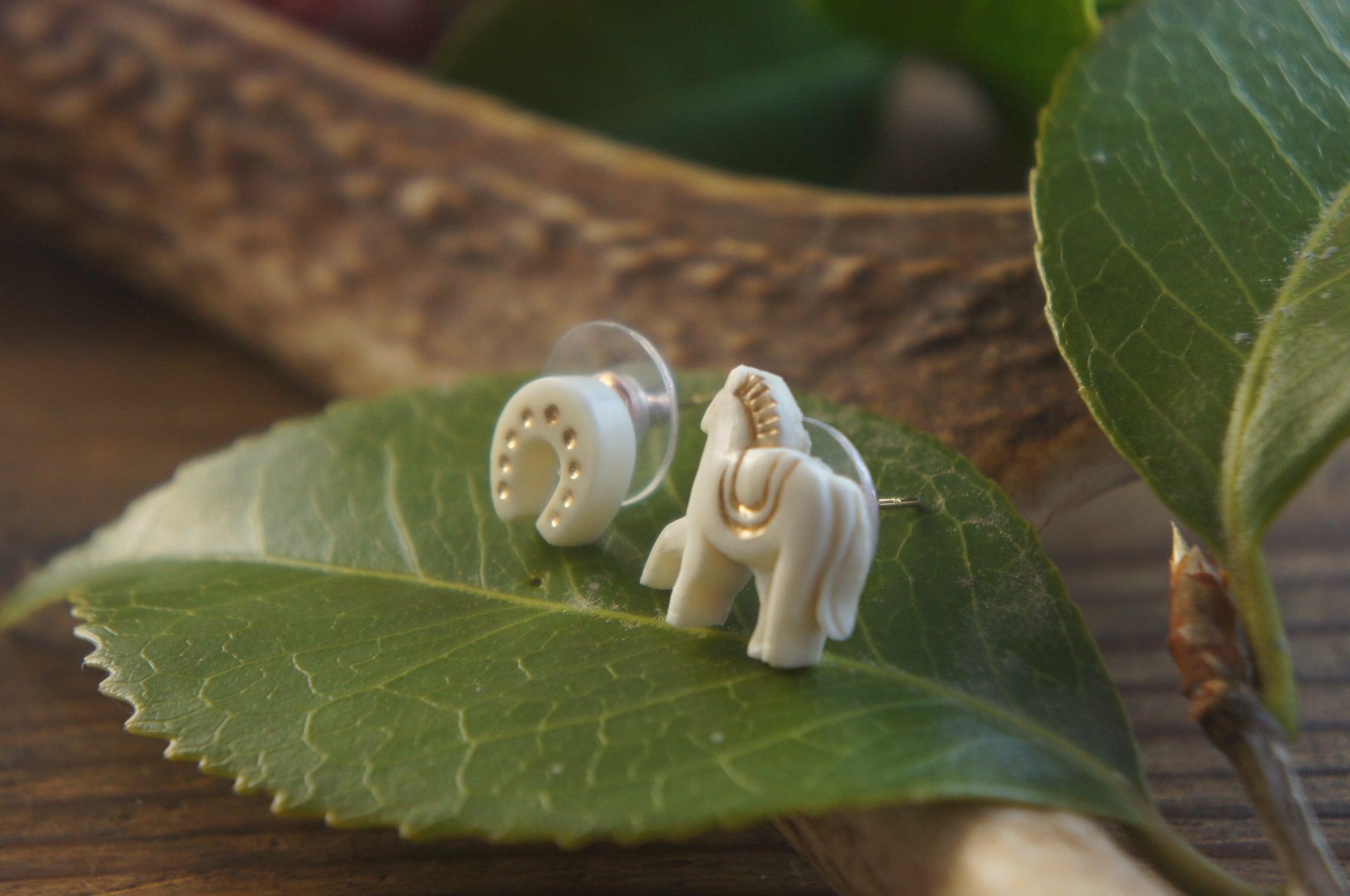 鹿の角を彫刻した小さな馬と、蹄鉄のピアス。