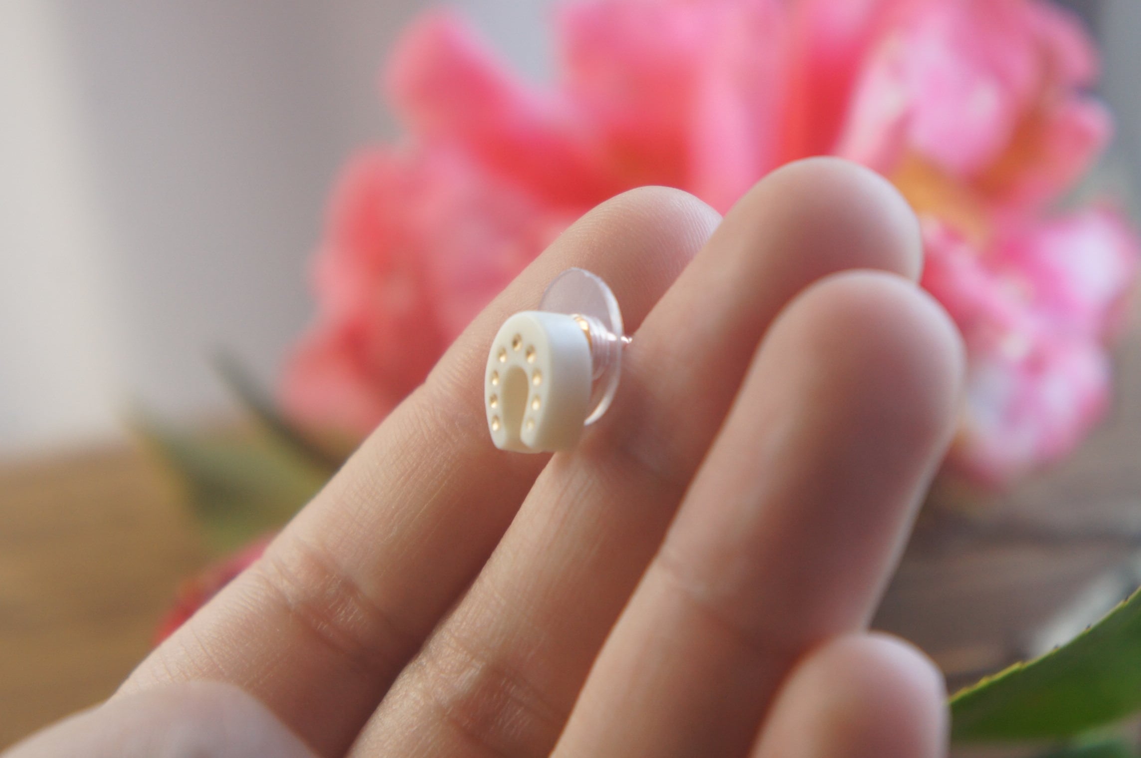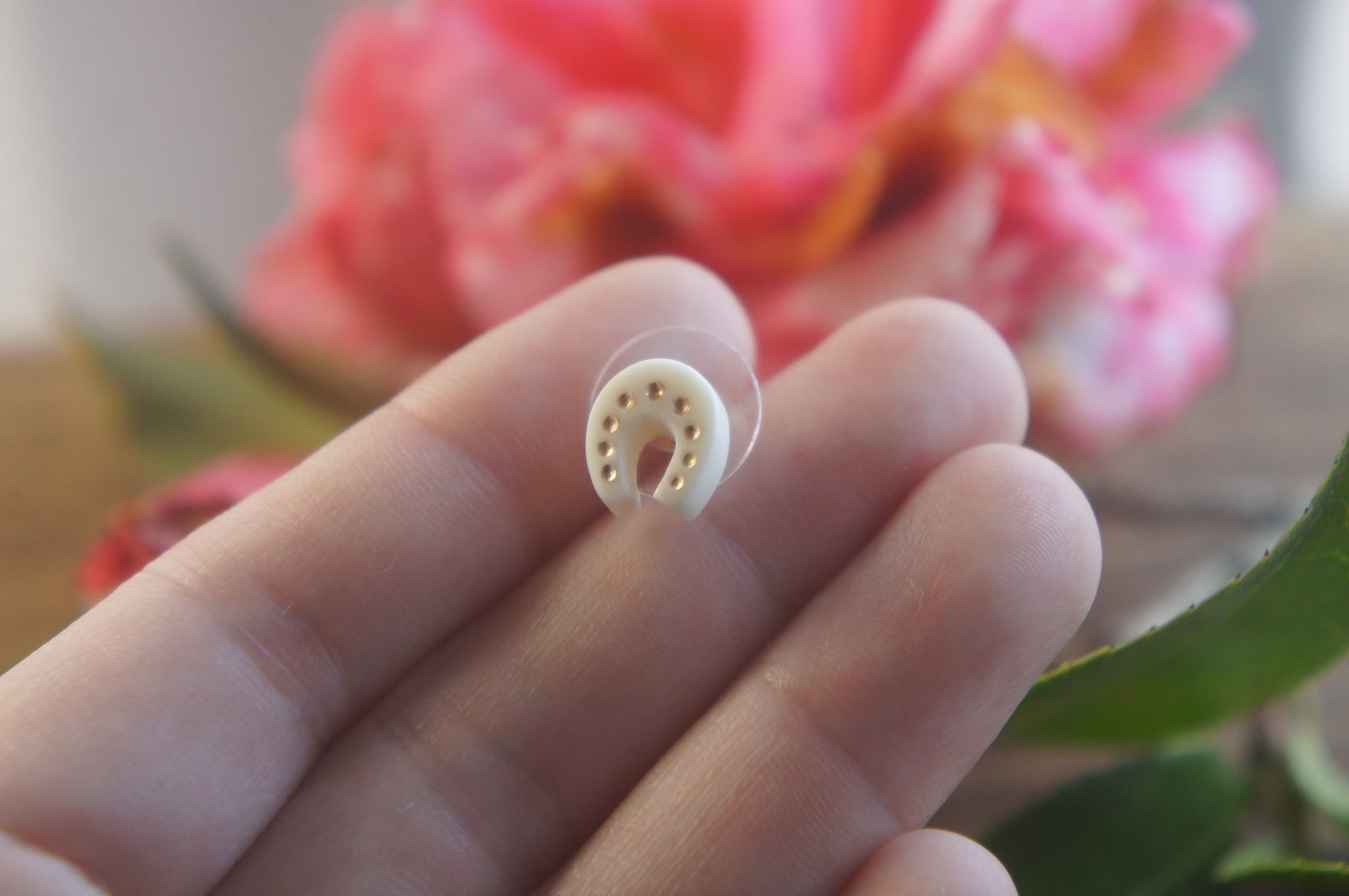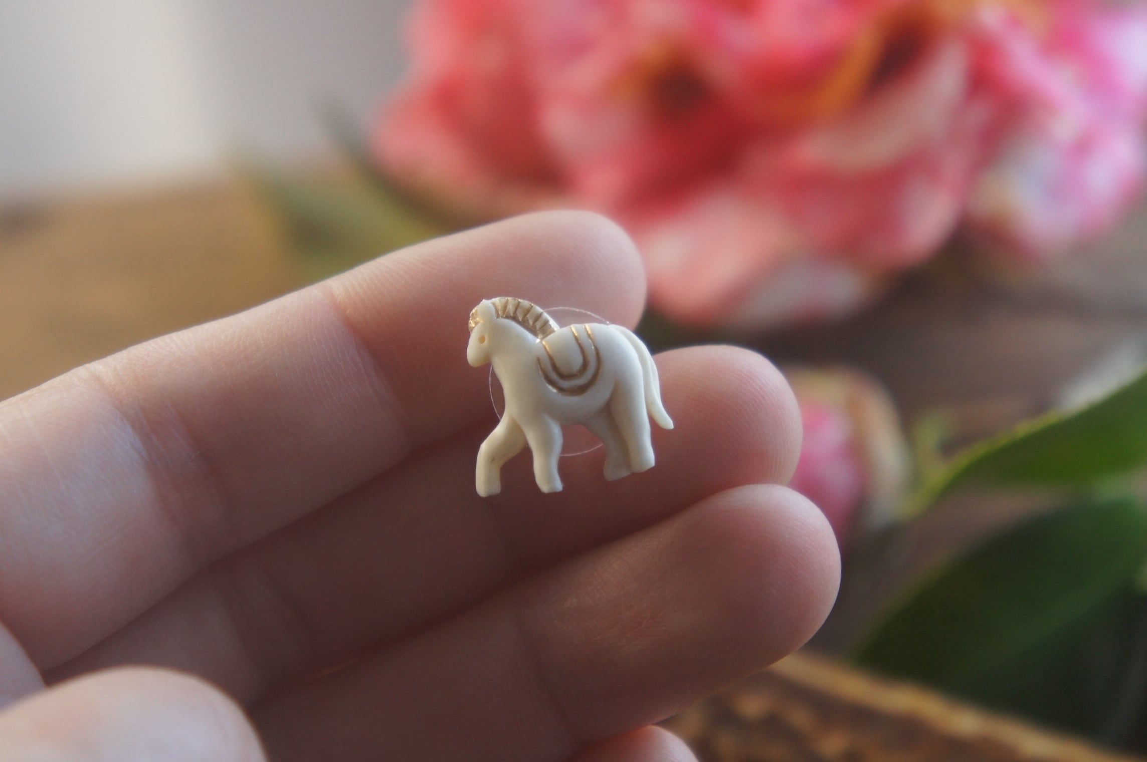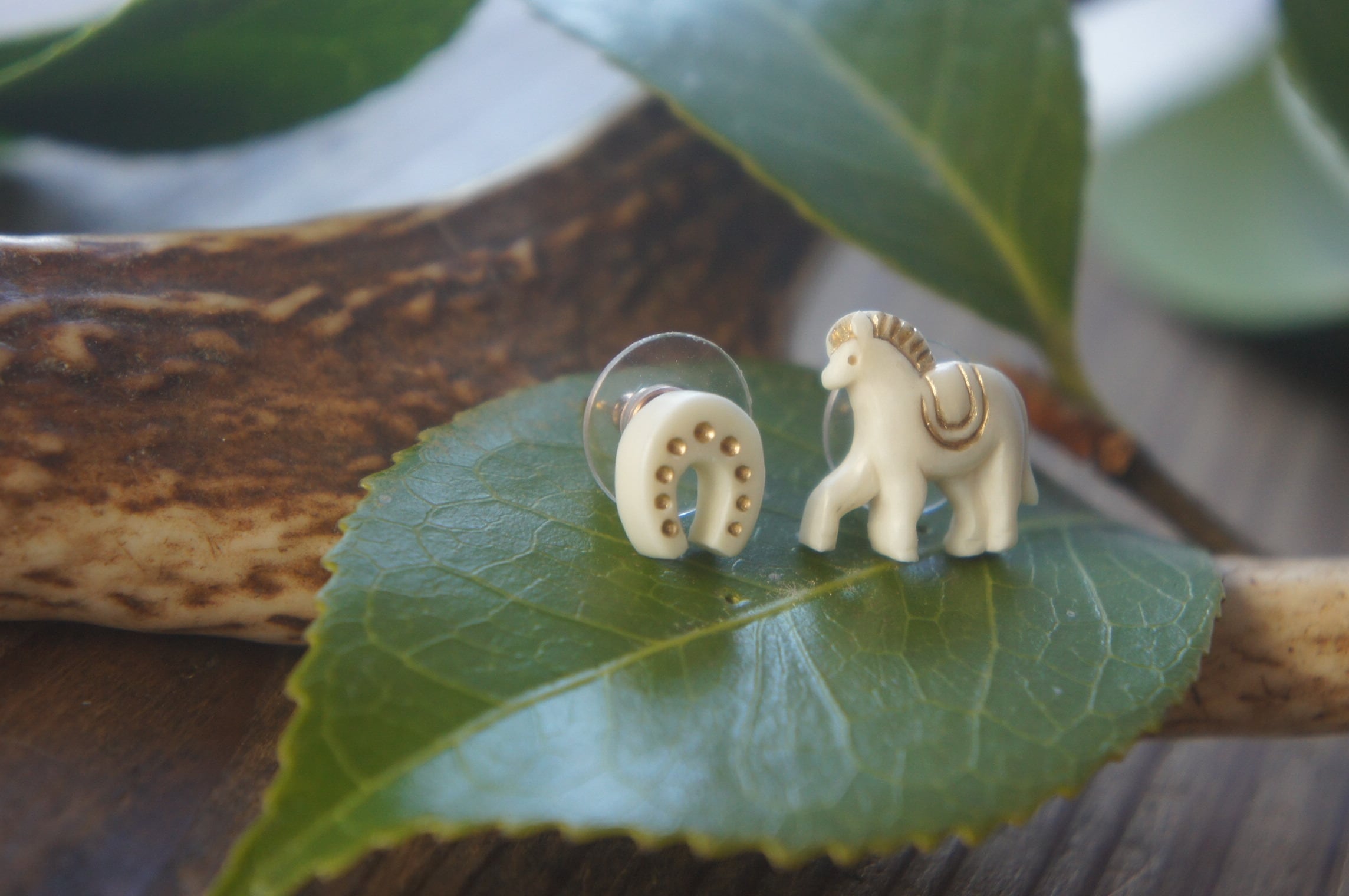 鹿の角を彫刻した小さな馬と、蹄鉄のピアス。