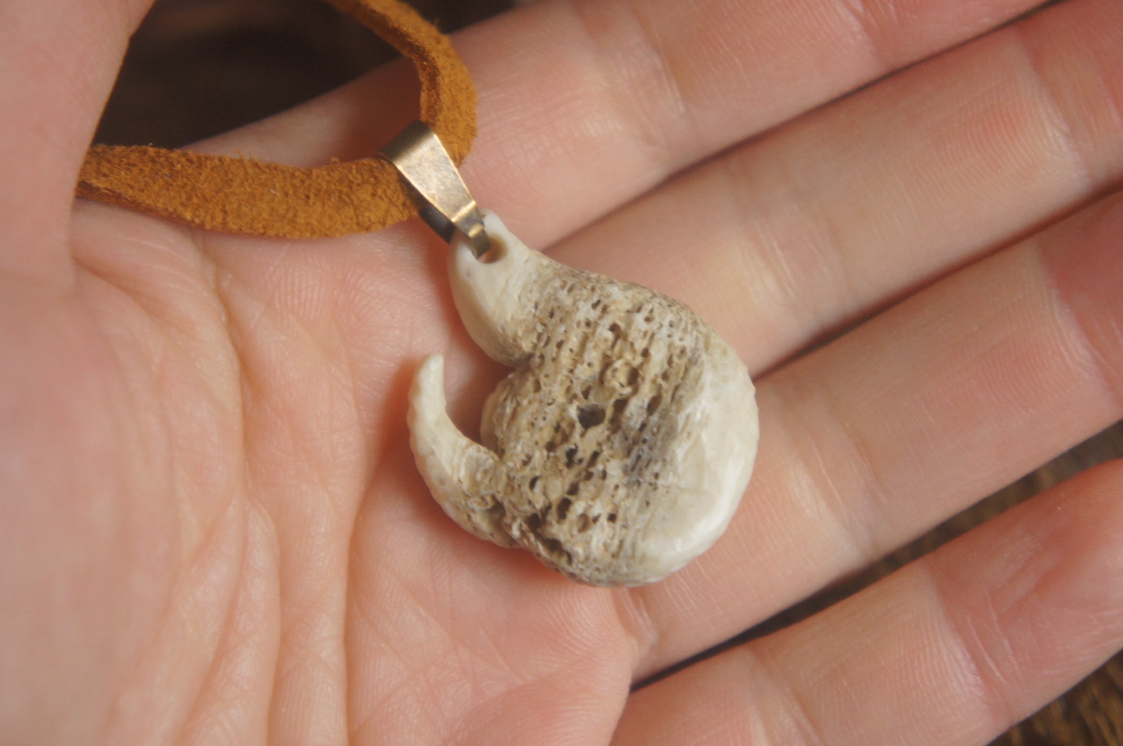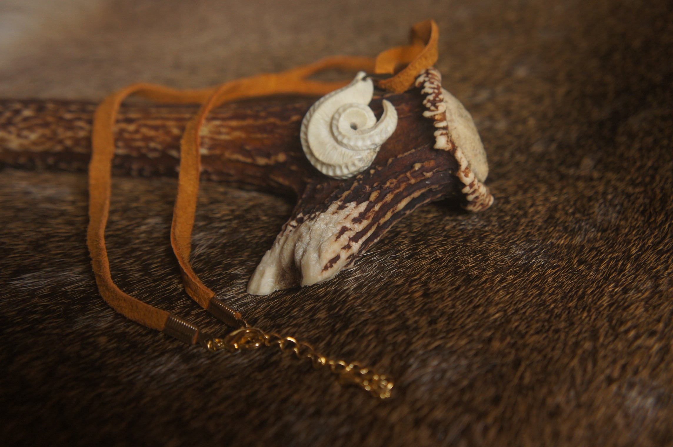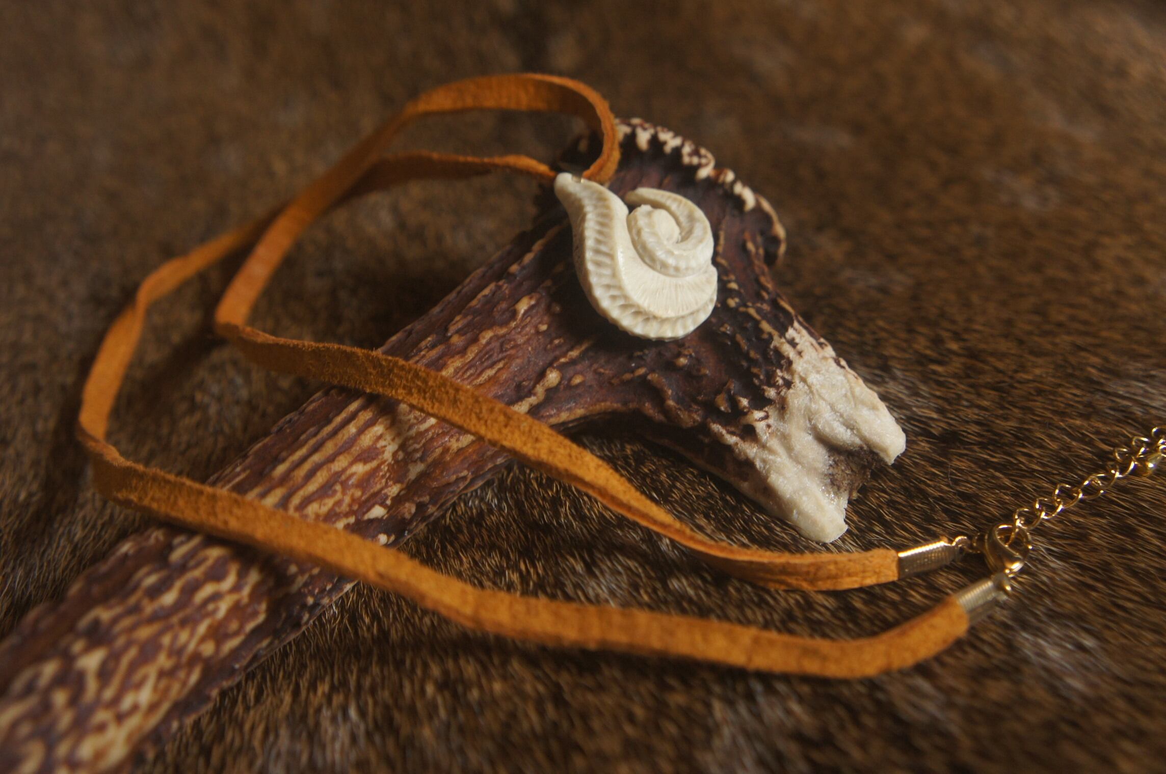 鹿の角からくるっと巻いた羊の角を彫刻しました。