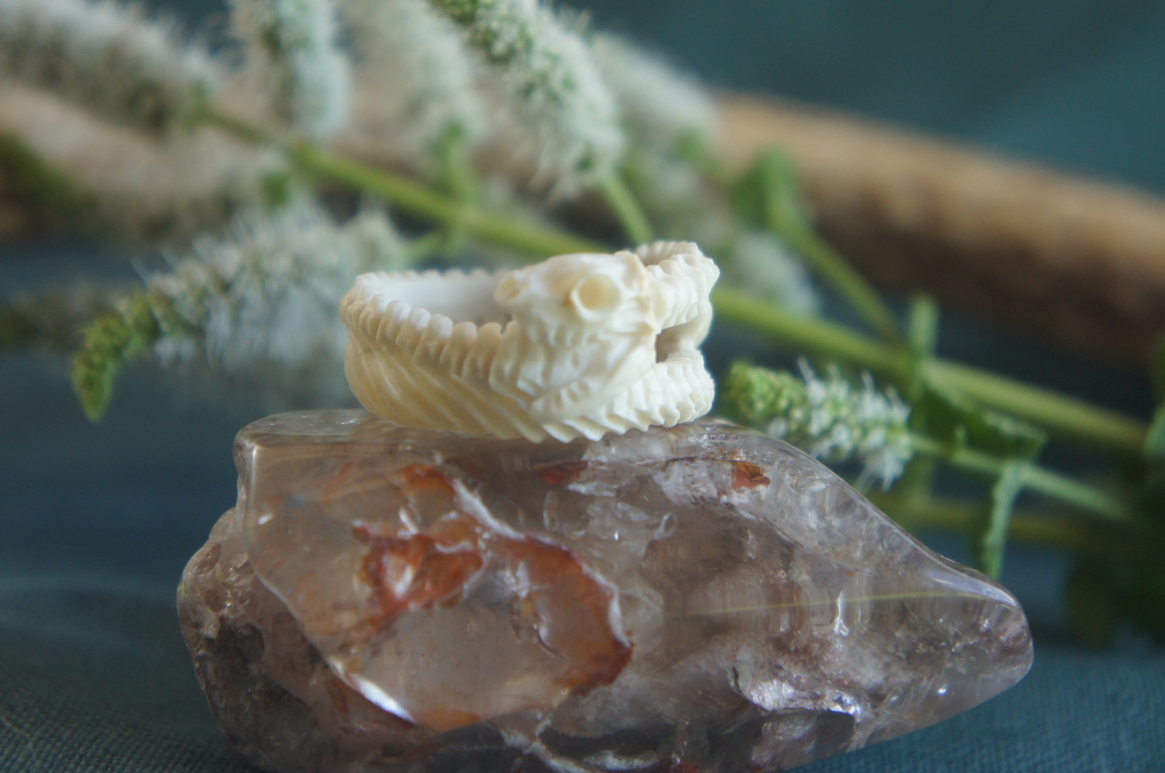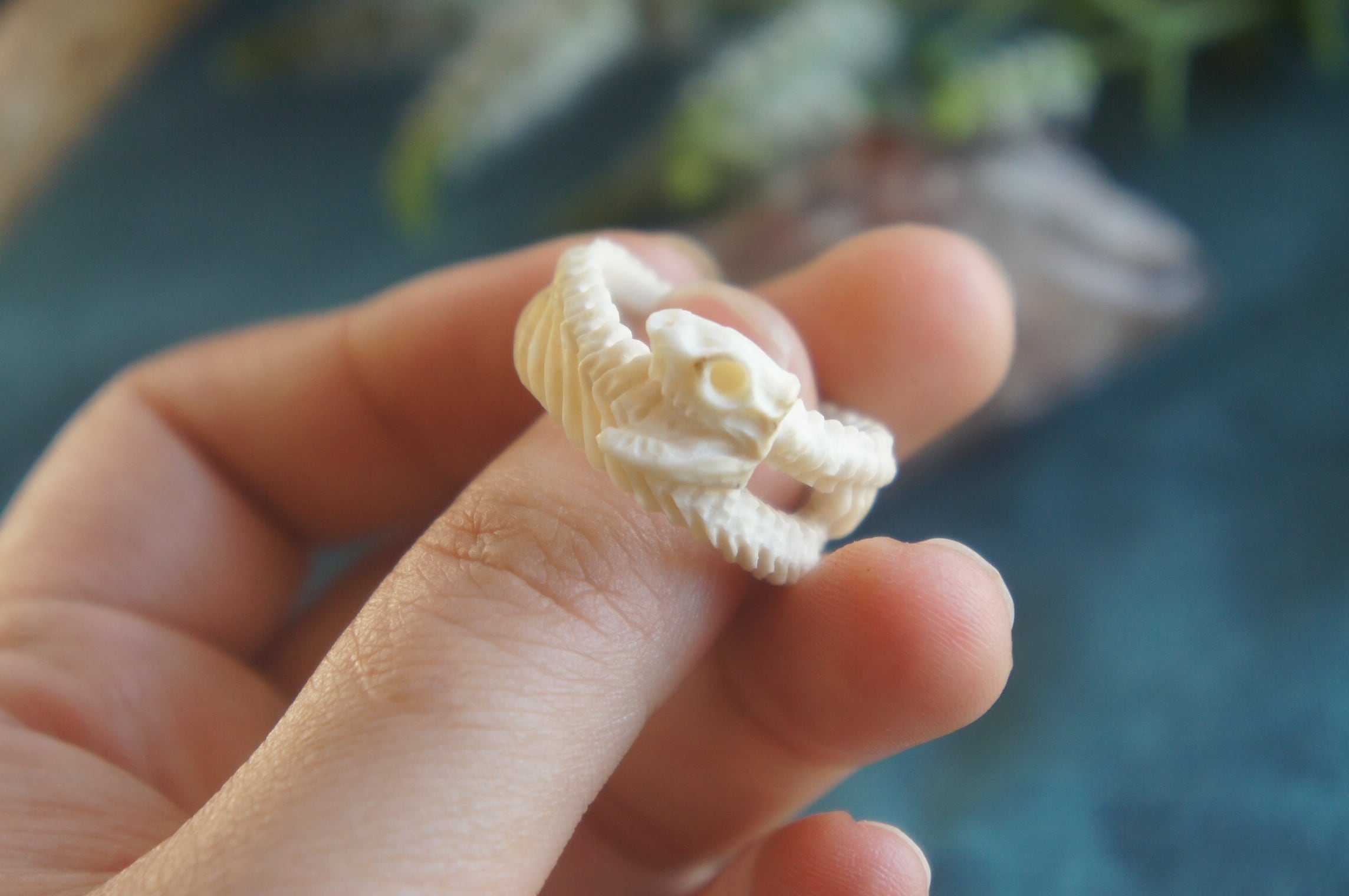 鹿の角から蛇の骨格を削り出し、指輪に仕立てました。